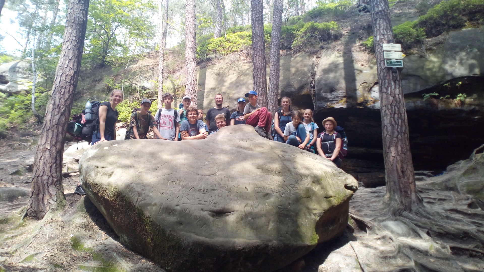 No, tak kde začít? Začal bych u našeho krásného probuzení do nového dne. Když jsme se probudili v sobotu ráno v lese, tak byl prostor povídat si a připravovat se na další dlouhou výpravu. Při přípravě jsme také měli čas na snídani, ke které byli různé druhy závinu a teplý čaj. Před výpravou (po snídani) jsme měli čas na douklizení svých věcí a také si zahrát Mölkky (hra je podobná kuželkám, pro podrobnější popis si zajděte za dorostenci) či házet si s frisbee. Konečně jsme vyrazili na cestu. Během výpravy jsme měli spoustu času popovídat si. Na cestě jsme potkávali spoustu zajímavých skal, vyhlídek a nádherné přírody. Za krásného a jasného dopoledne jsme ušli okolo 5 km. Na oběd jsme si zašli do skalních útvarů. Dali jsme si úžasně měkký chléb se salámem a sýrem. Odpoledne už jsme tolik kilometrů nešli, něco kolem 3 km. Při cestě jsme jedli, dělali spoustu hloupostí, povídali si, prostě jsme si užívali společný čas. Řekl bych, že jsme si to skvěle užívali všichni. Když jsme pokračovali dál a dál, tak za odměnu nám vedoucí koupili všem zmrzlinu. Dorazili jsme do cíle kolem 3 hodiny odpolední. Po příchodu jsme si zahráli spoustu her a vedoucí mezitím začali vařit vodu na čínské polévky. Už se blížil čas ke spánku. Část party se odebrala do jeskyně a druhá zůstala na vrcholku, kde si odklidila šišky, aby měli pohodlné spaní. Tento den byl velice náročný (bylo velké teplo), ale byl určitě zajímavý a zábavný.